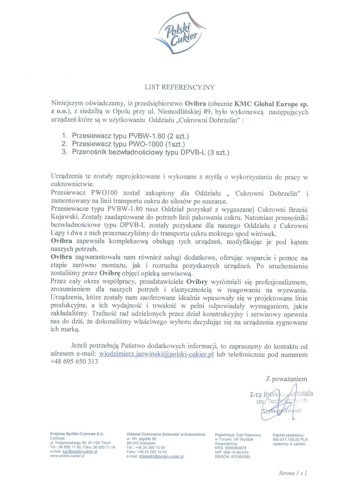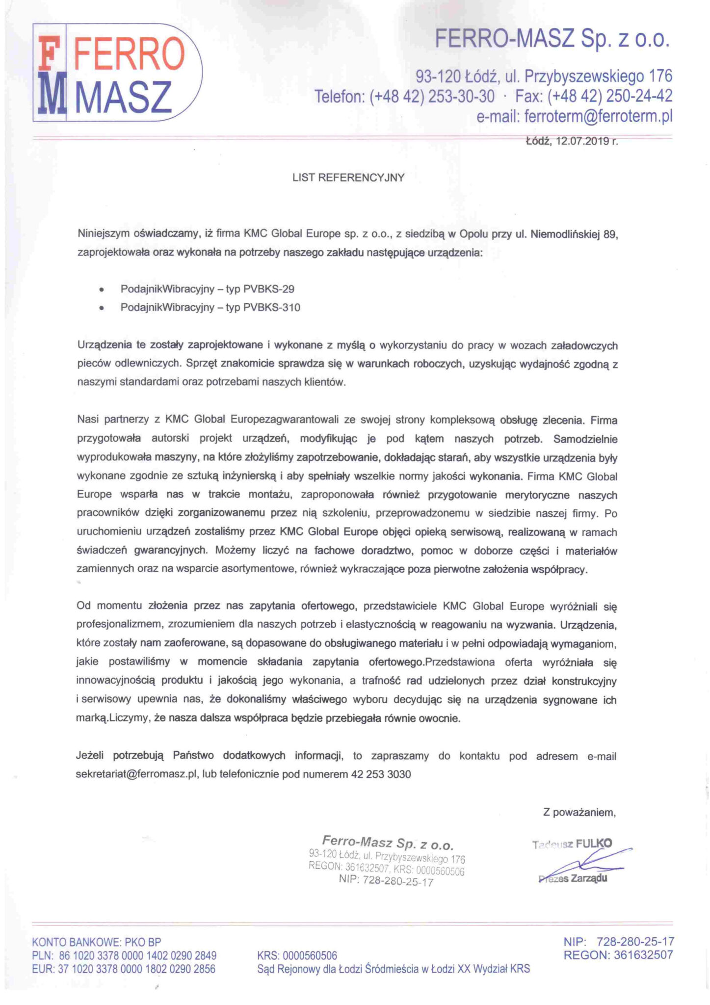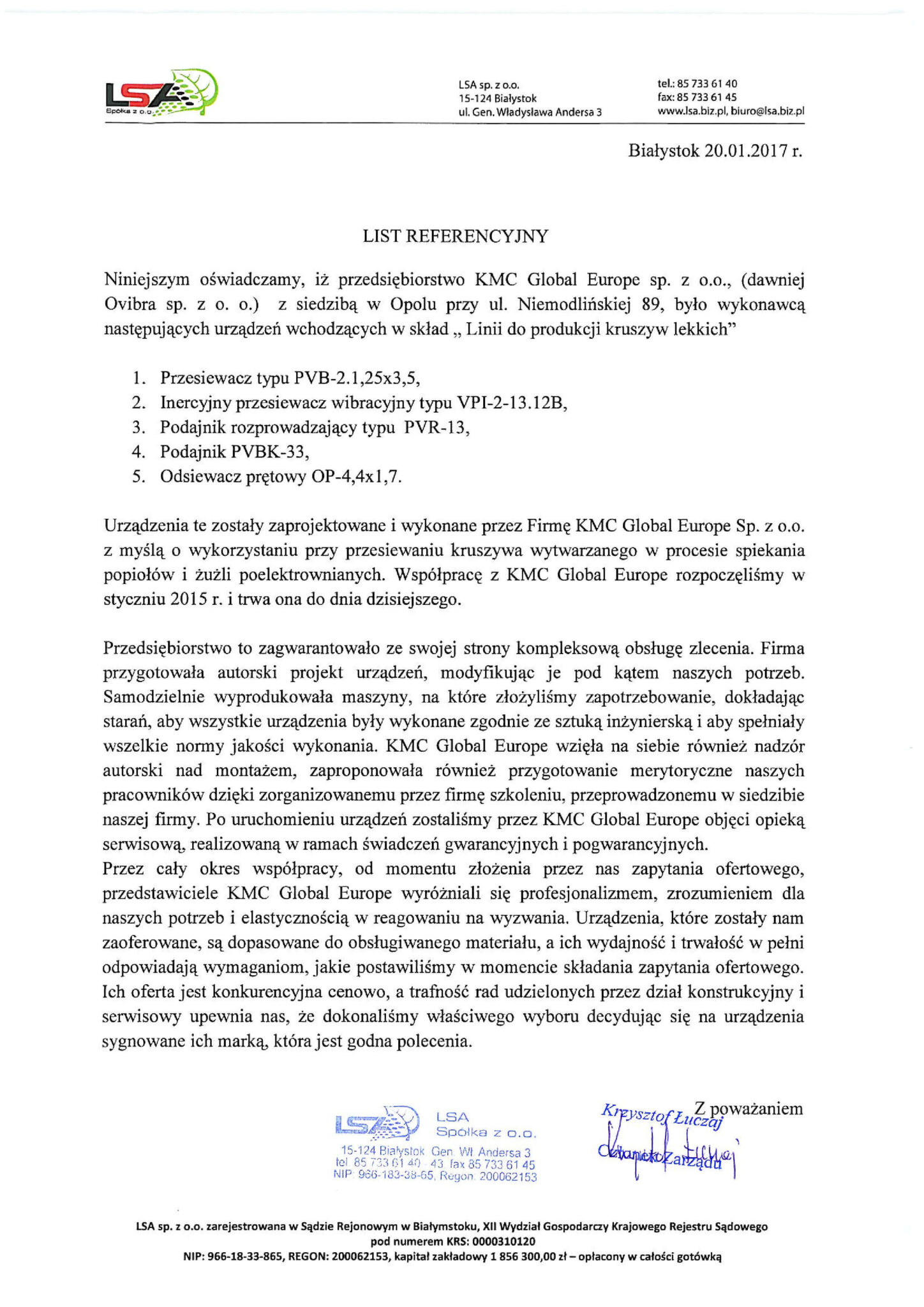In April 2012, Ofama VIBRA Opole joined the ranks of international members of the KMC Global group. KMC Global is an American group of manufacturing companies operating globally, bringing together enterprises that produce machinery and equipment for material transport and processing.