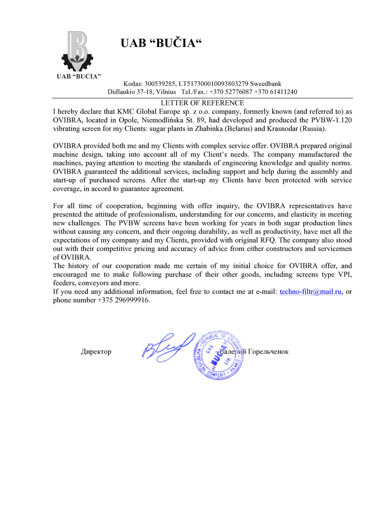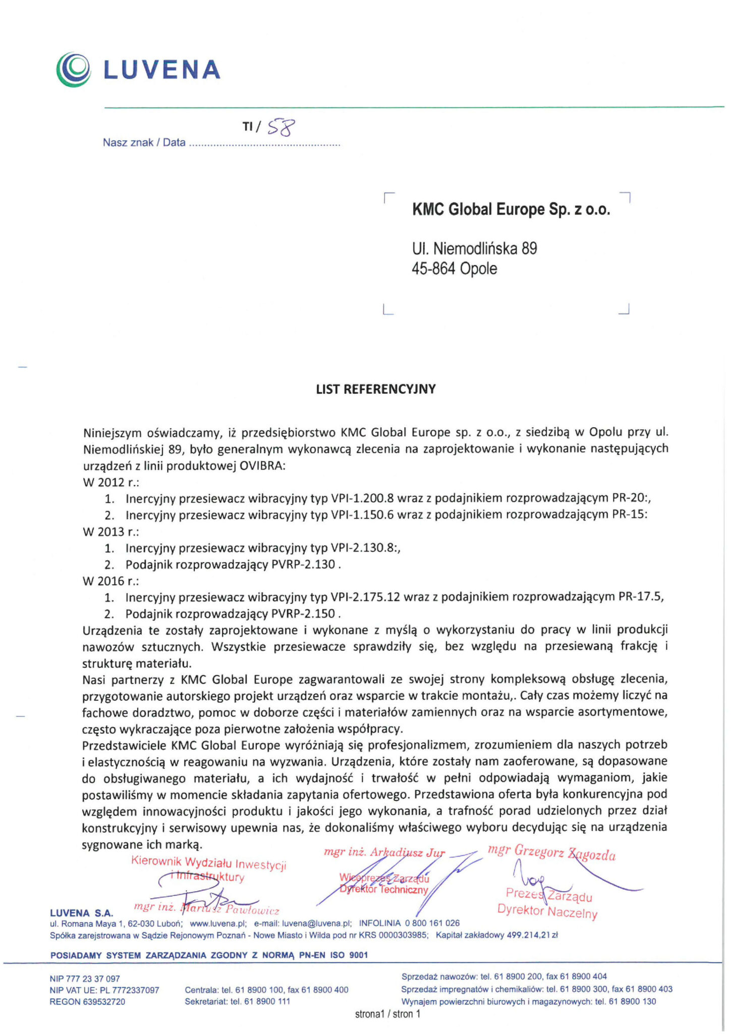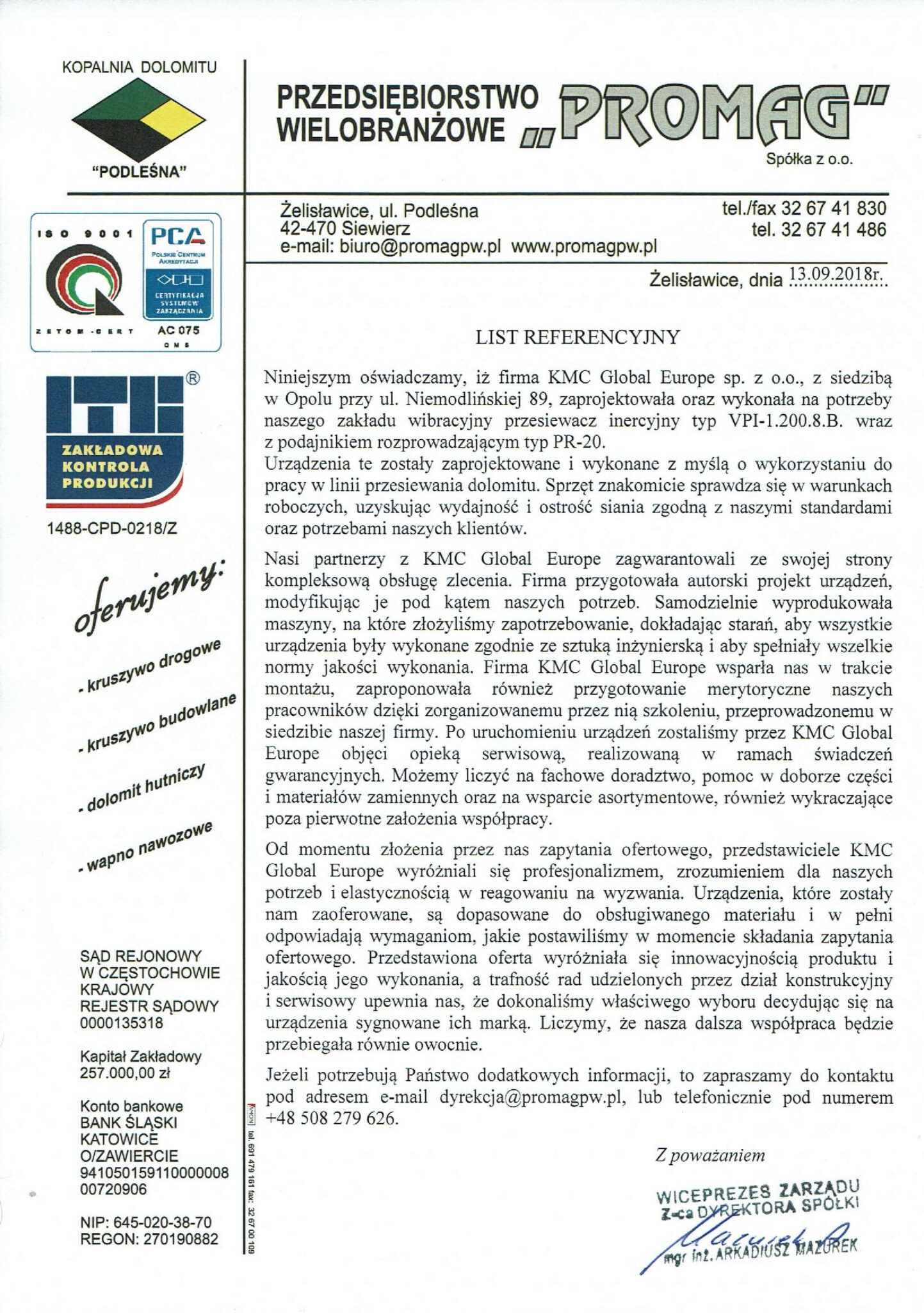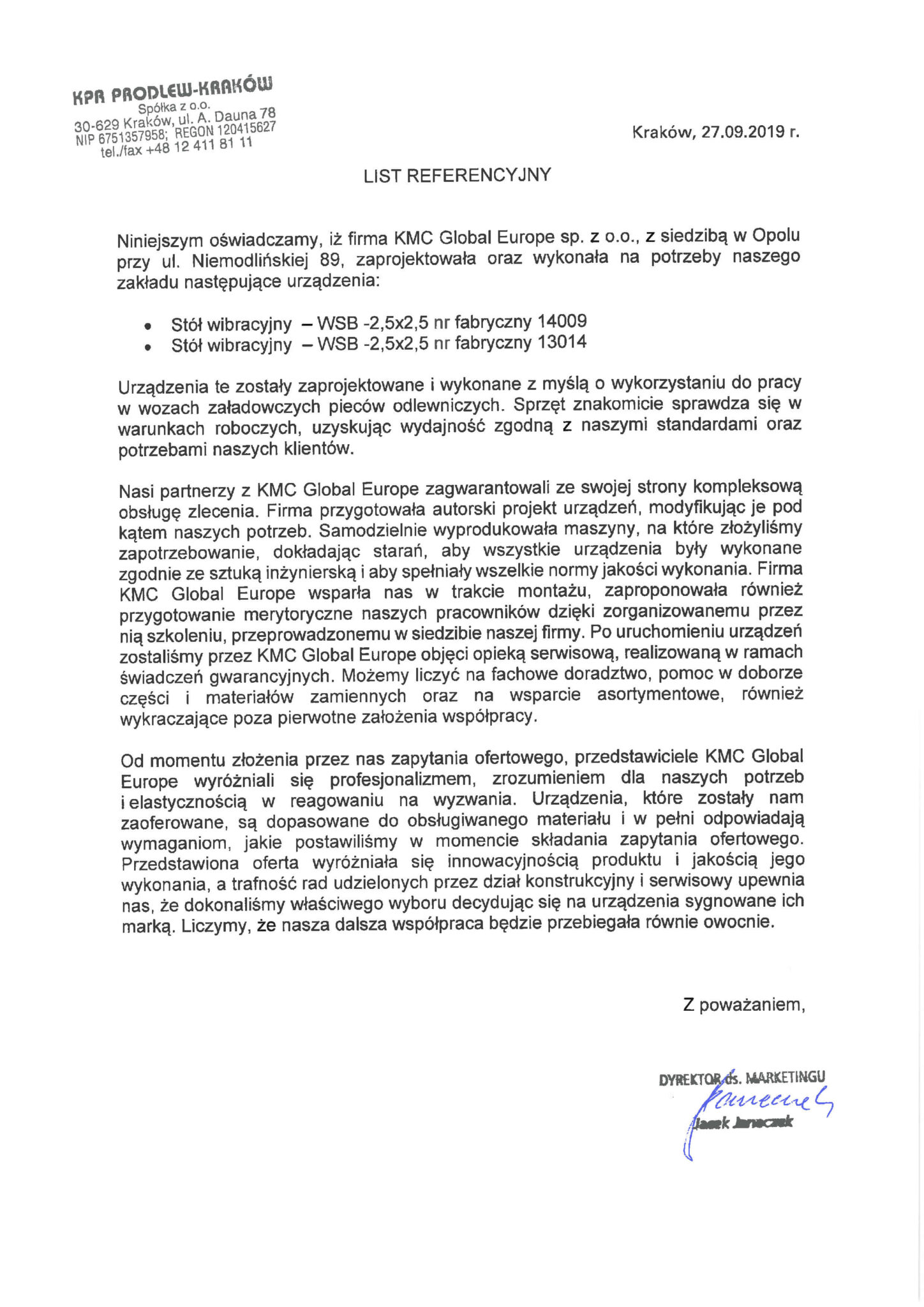 In April 2012, Ofama VIBRA Opole joined the ranks of international members of the KMC Global group. KMC Global is an American group of manufacturing companies operating globally, bringing together enterprises that produce machinery and equipment for material transport and processing.